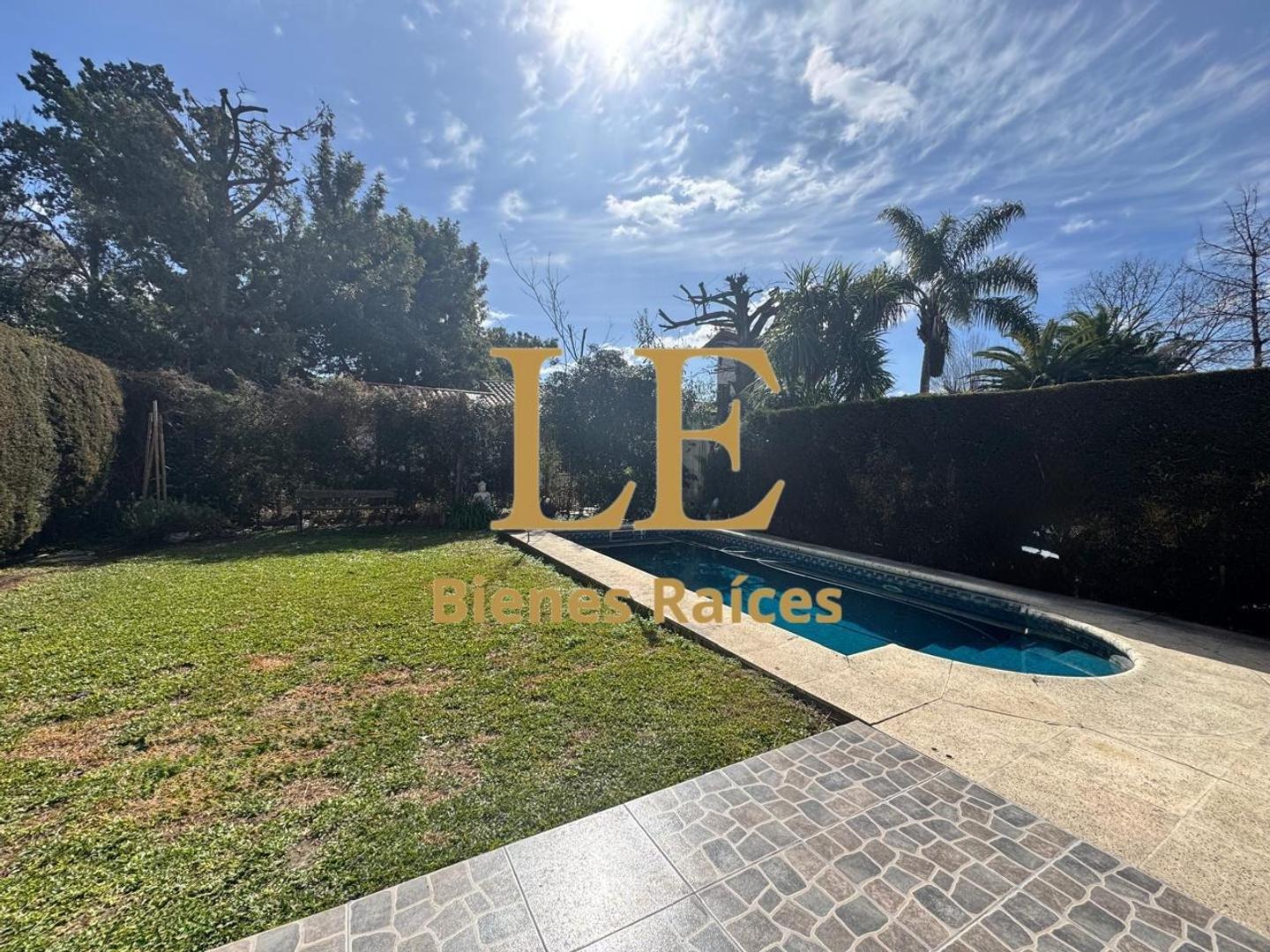 En el exterior tenemos un hermoso jardín con pileta, riego automático y orientación NO. Al frente cuenta con jardín y cochera cubierta para un auto.