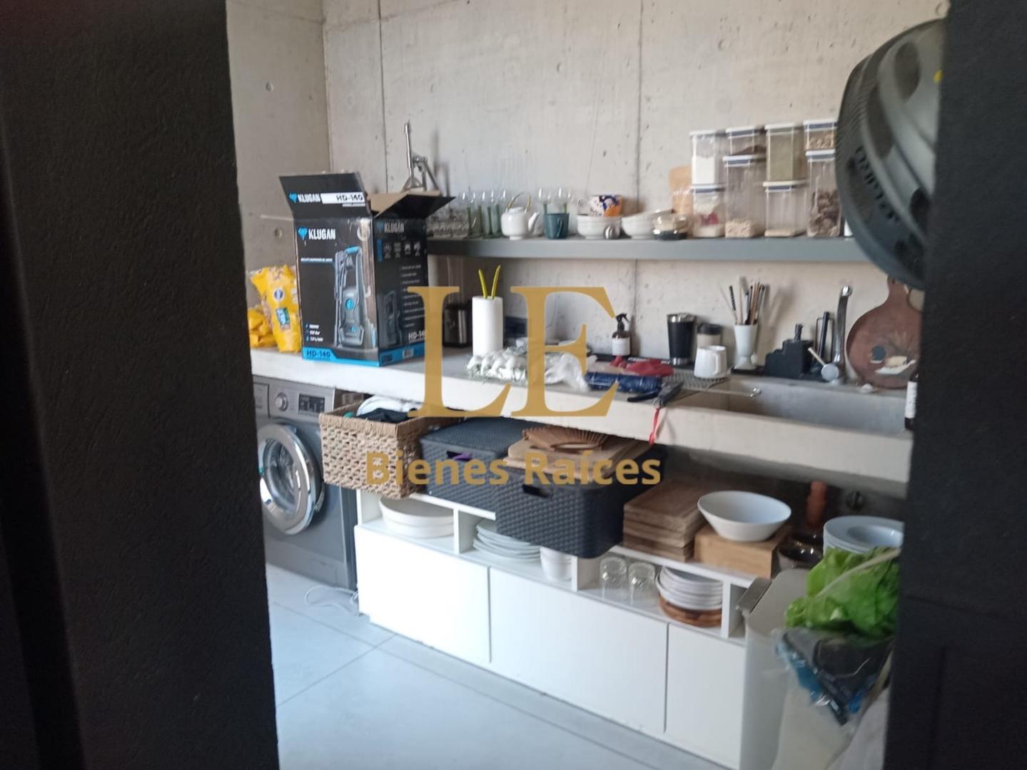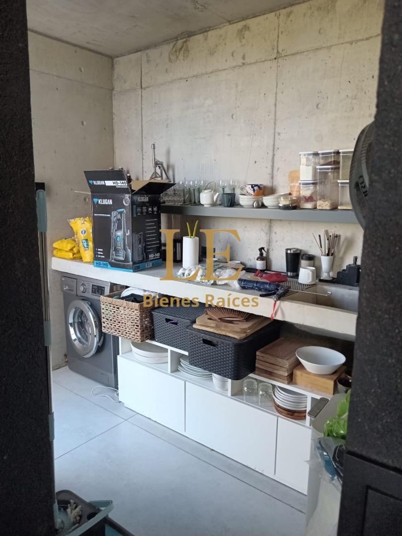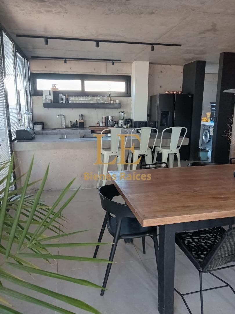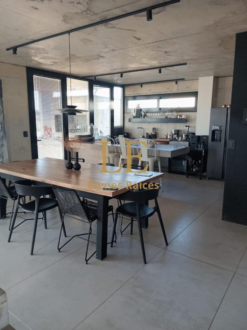 La cocina con comedor semi integrada con gran isla de hormigon,completamente equipada con modernos electrodomésticos. En el exterior, una cómoda galería con parrilla con cerramiento de hierro y un jardín privado con parquización y una pileta de natación con preinstalacion para climatizar por paneles solares.