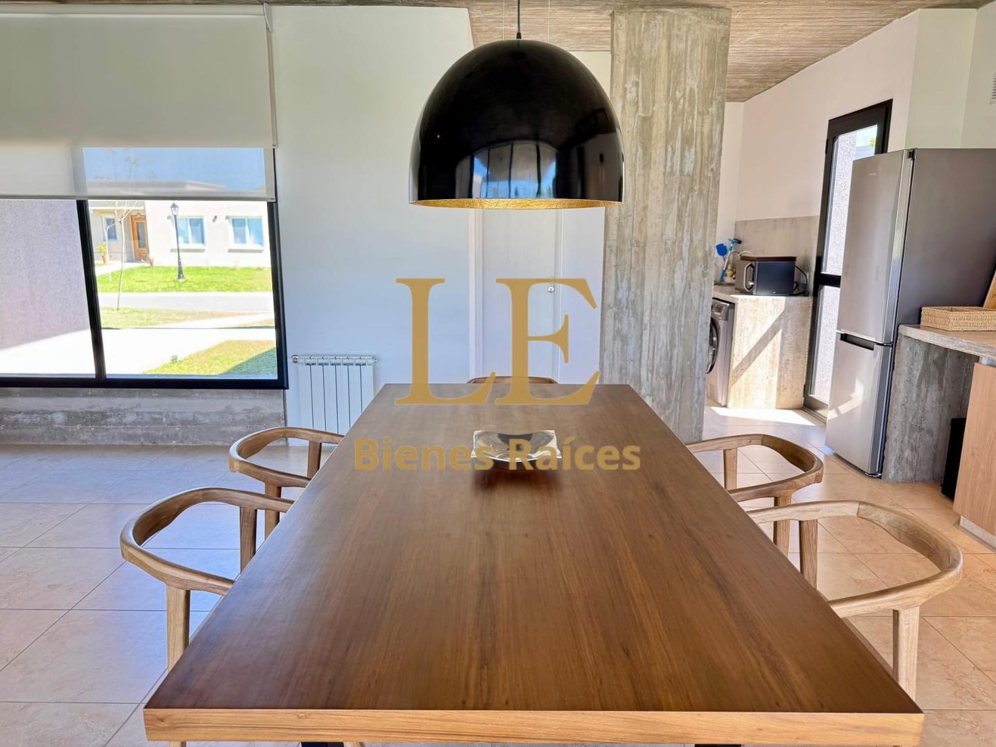 Al ingresar, una puerta de madera hecha a medida nos da la bienvenida. En el interior, el espacio principal integra cocina, comedor y living en un ambiente amplio, luminoso y funcional.
