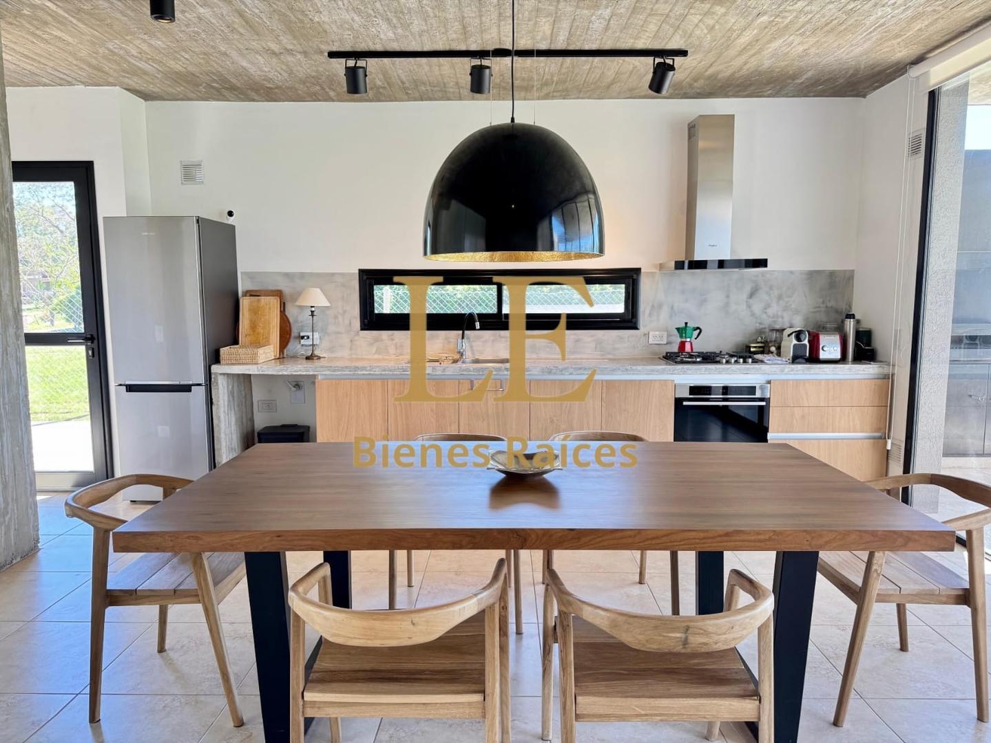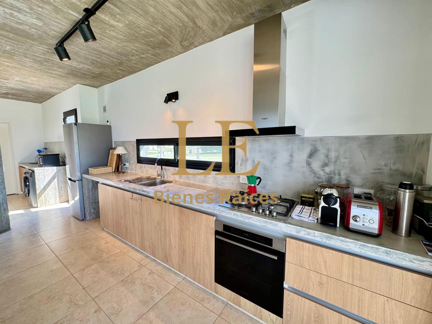 La mesa de cocina de cemento alisado patinado aporta carácter y estilo. La cocina cuenta con anafe a gas, horno eléctrico y campana Whirlpool, todos de excelente calidad.