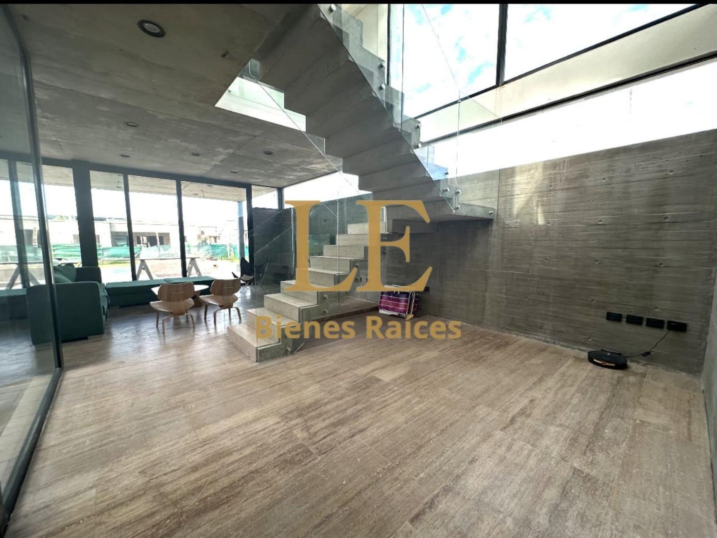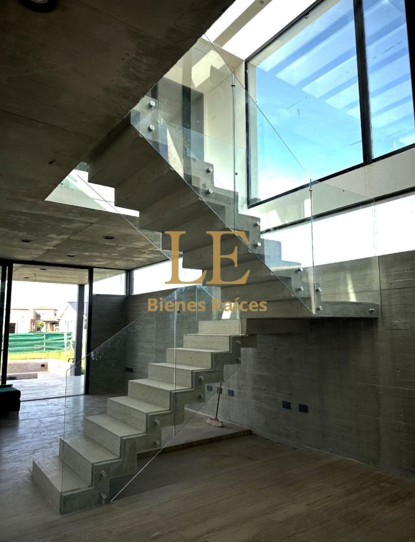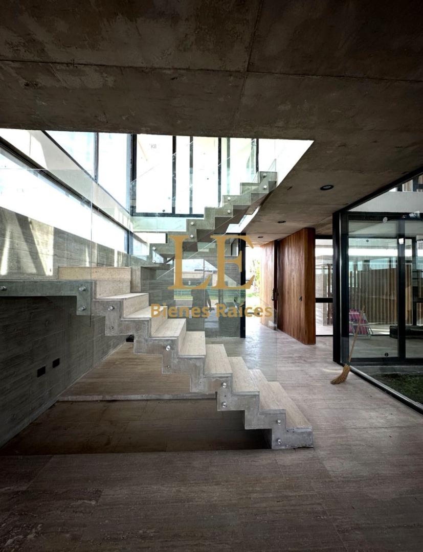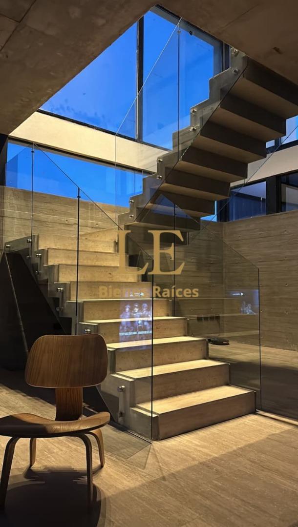 El diseño de planta abierta fluye sin interrupciones, creando una sensación de amplitud y luminosidad inigualable. El corazón de la casa es una espectacular escalera protagonista de hormigón en voladizo, con barandas de vidrio templado, que no solo conecta los niveles sino que actúa como una escultura central.