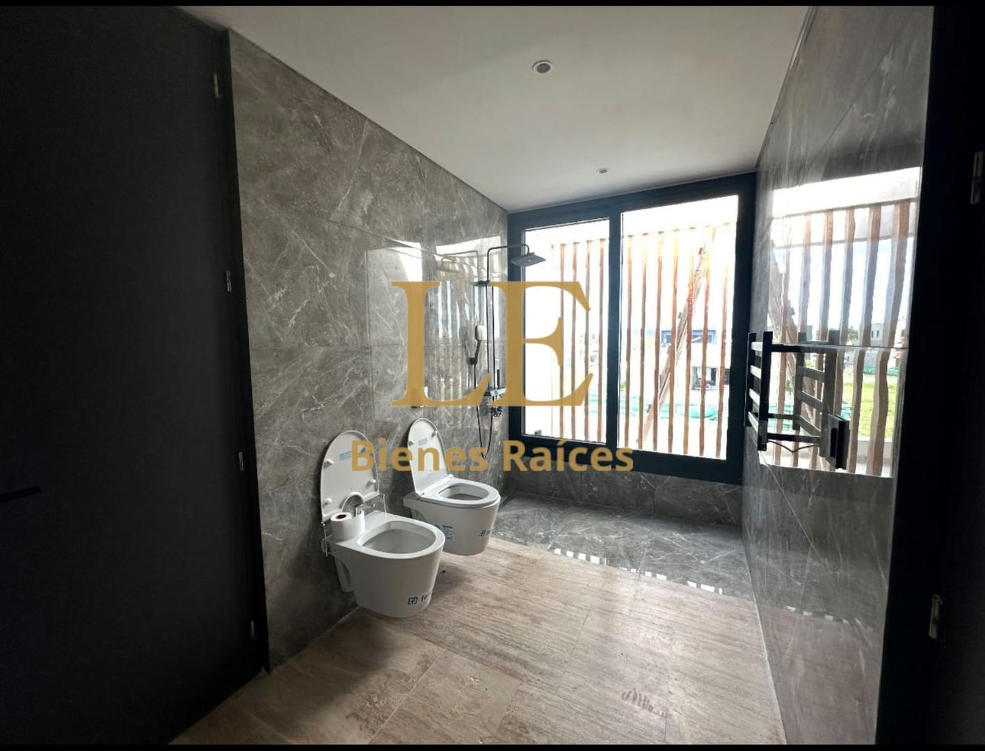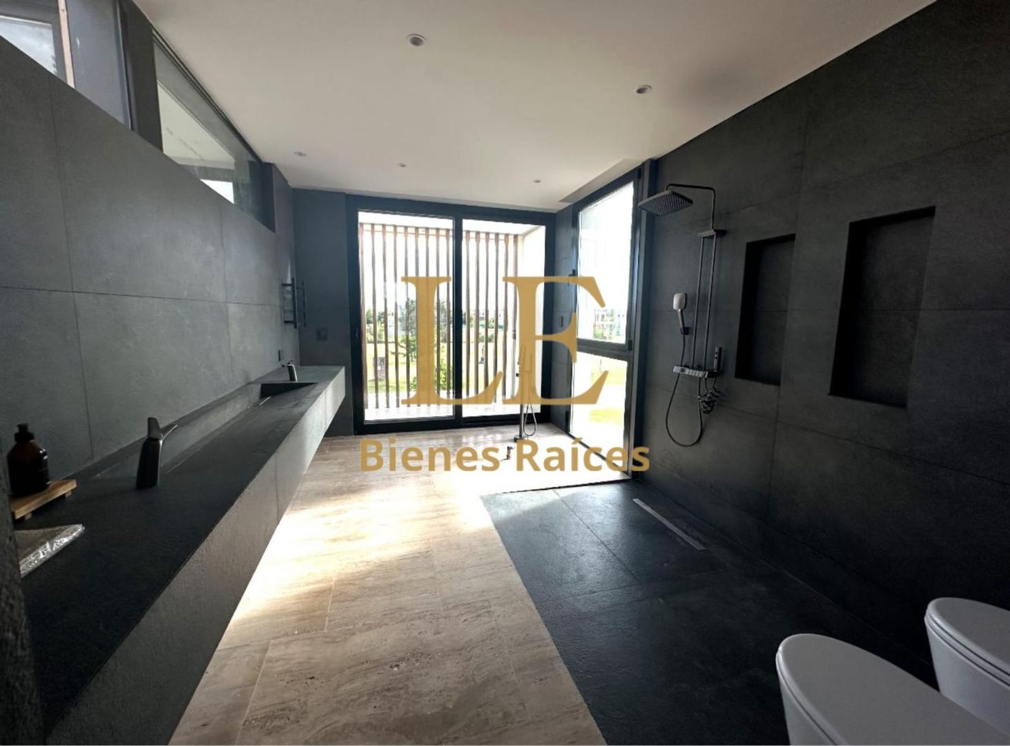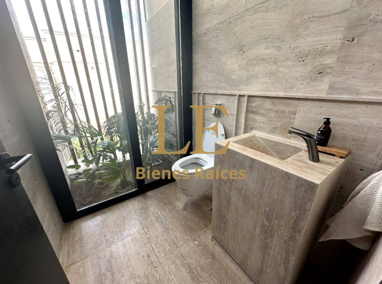 Los pisos de mármol travertino unifican los ambientes, desde el imponente hall de recepción con su puerta pivotante de madera maciza, hasta el amplio living-comedor. El hormigón visto, meticulosamente trabajado con encofrado de tablas, aporta una textura y un carácter que no encontrará en propiedades convencionales.